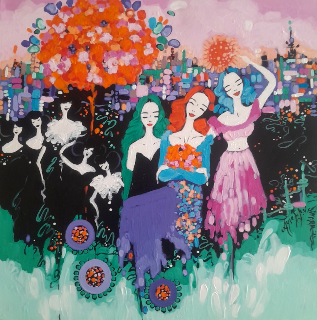 Who is Ayşe Şimşek? (1976 – Sinop)She was born in Sinop and completed her primary and secondary education in Sinop. She graduated from Karadeniz Technical University, Faculty of Fine Arts, where she started her art education in 1994, in 1998 and started working as an art teacher. She opened her first personal exhibition in 2003 and participated in various group exhibitions. She still continues her art works in her own studio in Sinop. The artist uses the signature Ayşe Ekşi Şimşek in her works.Art PerspectiveMy existence on earth as a woman and her desire to leave a mark as a woman led her to meet with the Women of the Fairytale City. The creative process is a journey you make to yourself with sincerity and forgetting everything you know. The women she meets on these journeys sometimes represent a little bit of me, sometimes the souls of many women, women who dream, change and beautify reality in their own inner world. The blindfolded women in her figures symbolize free women with dreams who beautify and transform reality in their own colorful world. The strongest narrative element in his paintings is women, but the expressive power of colors is at least as important as what women say. This is an important part of his creative process for him. In his abstract figurative approach, concrete and abstract elements become subjective with the meanings he attributes to them. They become an indispensable part of this creative process and the resulting works.