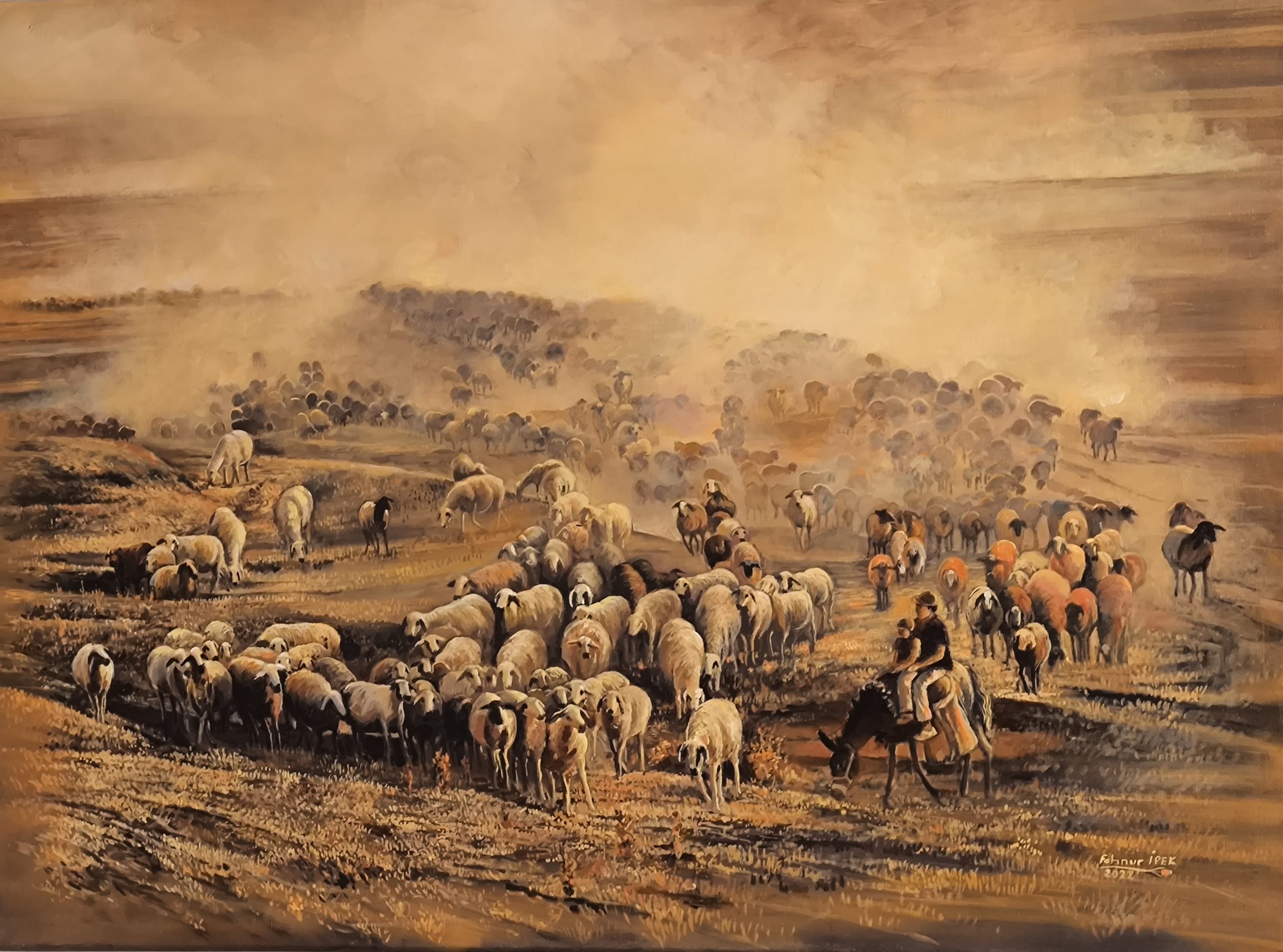 Who is Fehnur İpek? (1964-Artvin)Born in 1964 in Artvin, the artist completed her primary education in Erzurum and secondary education in Ankara. Graduating from Gazi University Painting Department in 1984, the artist taught painting and graphic arts in various cities and districts throughout Turkey. She completed her public service in 2005 and continues her painting works at the Büyülü Brush Art Gallery, which she founded in Ankara in the same years. She is married and has 2 daughters.The artist, who has participated in 105 exhibitions, 30 of which are personal and 75 of which are mixed, has works in different collections in Turkey and abroad.The artist, who is a member of GÖRSED, BRHD, SEDER, IWS, aims to follow the changes and developments in painting and to keep the diminishing natural beauties alive through painting and to share this knowledge with her students and carry it to the future.For her, art and painting are natural phenomena like living, breathing and freedom. Based on these essential facts, she wanted to include nature and natural beauties in her works; she wanted to reflect a society and nature that is far from the mechanized, industrialized society and nature.In her paintings where man and nature are integrated, the artist also emphasizes that the essence of nature and man is one.