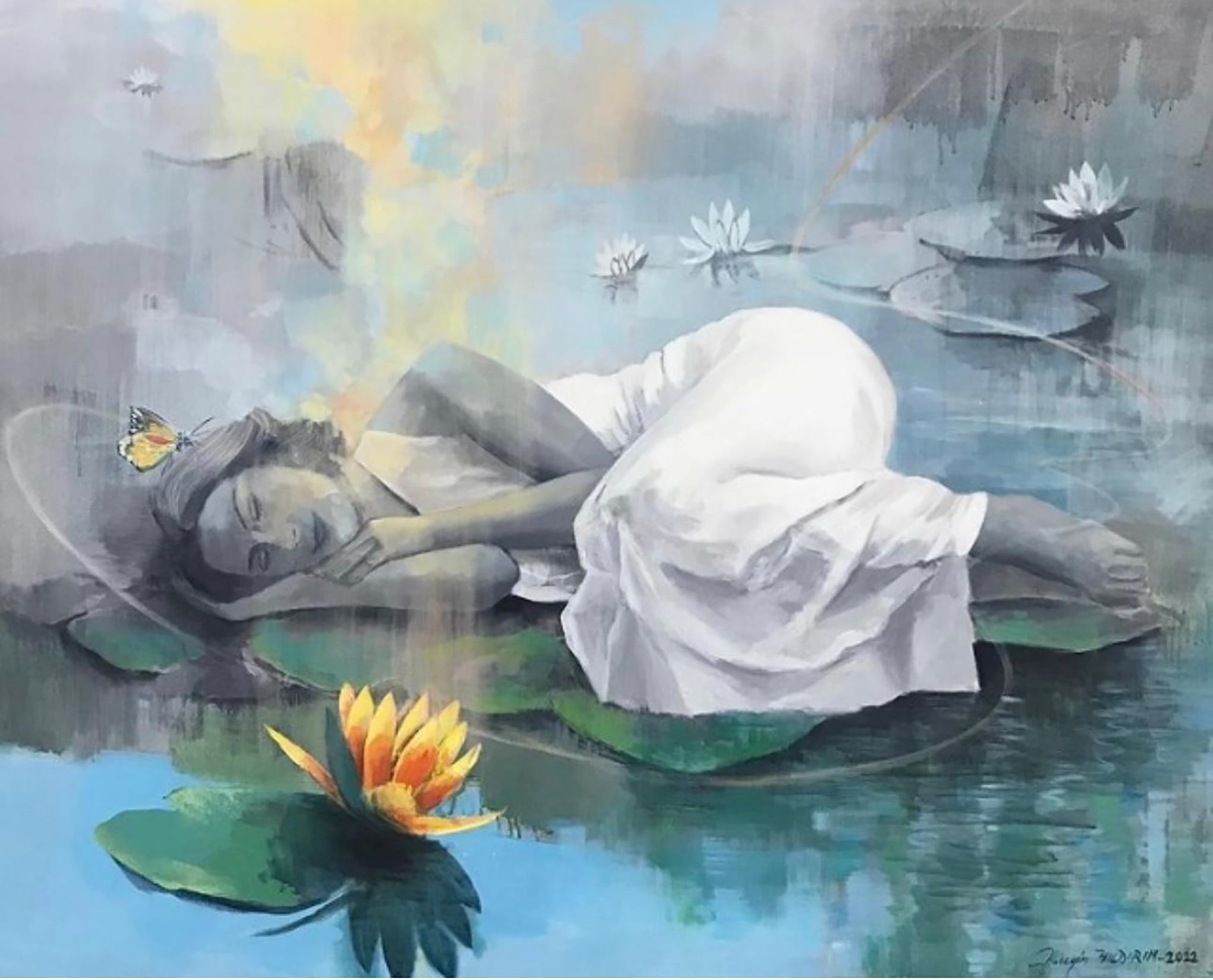 “In his paintings, I can see traces of pure nature-loving as well as metaphysical thought and purifying Eastern philosophy. Artist Hüseyin Yıldırım reflects the traces of the dreamlike processes he intensely experiences in his paintings. He conveys his aesthetic excitement, enthusiasm, and sensations through the universal symbols he chooses, creating his own dream world. In his paintings titled “I Dream,” he presents anonymous images such as ‘woman, sea, lotus flower, butterfly, moon and sun, ancient structures’ to the viewer like a film scene, as if through the eyes of a masterful cinematographer. As a viewer, while watching one scene presented to you, you become involved in other scenes and begin to live your own dreams. According to Schopenhauer, Dante’s greatness stems from his profound understanding of dream reality. Because an artist is someone who can do in waking life what they do in a dream. While depicting one’s own dreams with flawless images and symbols is the fundamental measure of success for an artist, making the viewer a willing participant in these dreams is the ultimate achievement.”