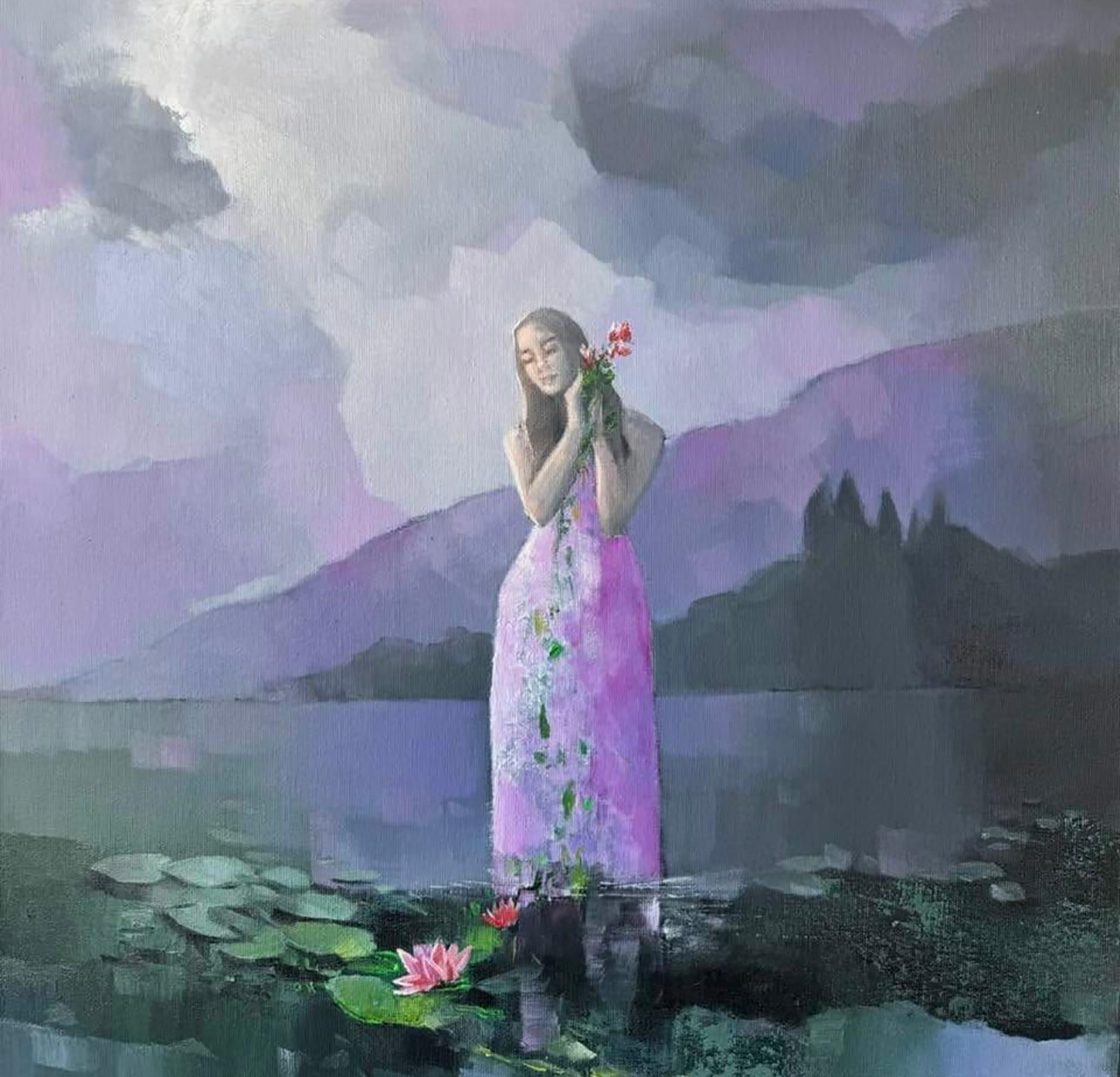 In Yıldırım's paintings, the common space of dreams is the atmosphere of the sea and mountains, dimensionalized by tonal richness of cold and warm gray-blues, greens, and turquoises. The painting surface is often illuminated by the enchanting sunlight rising from the mountains and the depths of the sky. Sometimes, everything is gently bathed in the redness of a sunset. It is a journey of longing, starting from a bay in the Mediterranean and extending to the gentle slopes of the Taurus Mountains, a journey into the subconscious of the geography where childhood and early youth were spent. In his paintings, everything is reflected and transformed into water. The images on the sea surface do not accept one-dimensional perception; they are created with different perspectives and meet in different layers of space. Events that cannot be seen objectively meet the viewer's eye simultaneously in a new reality and a fantastic narrative. The main protagonist of the dreamlike narratives is the female figure, like a nymph in the sea, emerging from a luminous-mysterious light. Often with half of her body submerged in the water, in an innocent, even somewhat melancholic, iconic pose, her face indistinct, the gradually receding female figures are symbols of different identities. Deep within the subconscious, female figures, each coded as a prototype of different lives, create new stories on the surface of the water with their theatrical postures.