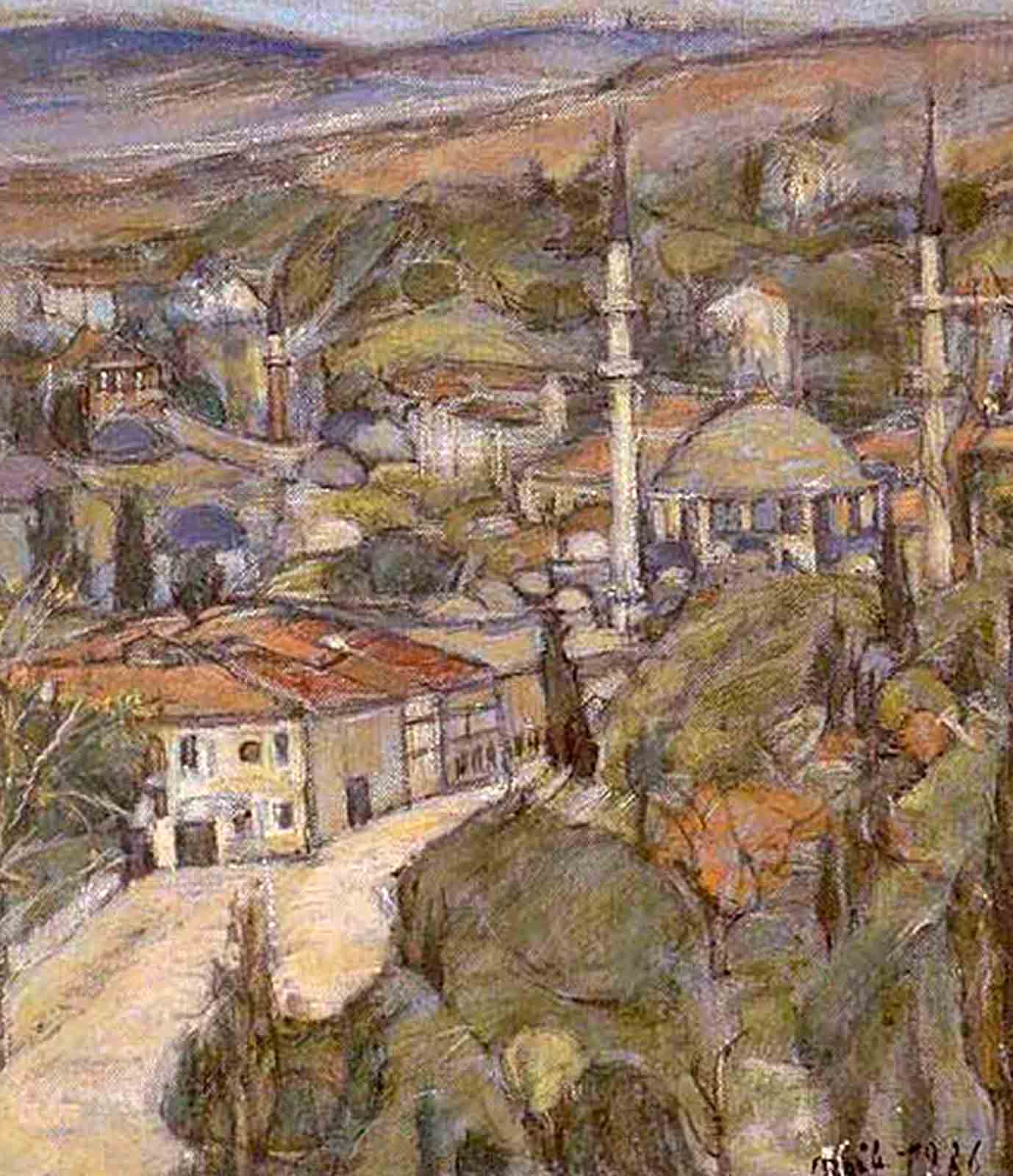 Naile Akıncı, while representing a unique iconography, holds a special and privileged place in Turkish painting. Avoiding copying nature, her works are far from an impressionistic approach. Known as a painter passionately attached to Istanbul, Naile Akıncı attracts attention with her variations reflecting her passion for the city. In this sense, Akıncı's signature is almost synonymous with "Eyüp," and she is considered one of the strongest landscape painters of Modern Turkish painting in the art world. The artist, whose name is synonymous with the Eyüp district, created variations on all the picturesque spots of Istanbul, such as Bebek, Ortaköy, Küçüksu, and Anadolu Kavağı, especially her “Eyüp Variations,” which are among the works in which her unique style can be easily discerned.[3] It is also possible to see the works reflecting the unique regional colors and characters of the Marmara and Ekinlik Islands, where the artist partially settled in 1962, as well as some arrangements, self-portraits, and still lifes depicting the island women, fishermen, horses, and cats that influenced her life during this period. Naile Akıncı expressed her commitment to art with these words: “Seventy-five years… Seventy-five whole years spent alone with my canvas, without betraying each other, without getting bored and turning our backs. If I sift through the hundreds of words that come to my mind when I look back, only one word remains to summarize my feelings: Gratitude.”